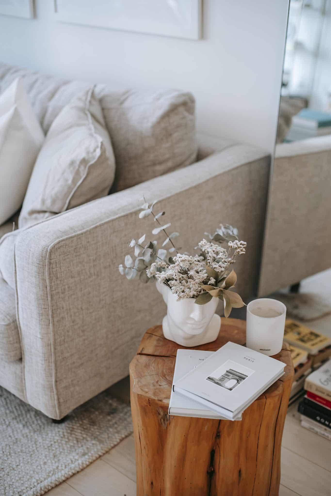 Photo by Charlotte May Creative Mashups ~ Cozy sofa with decorative cushions near stump with books and blooming flowers in vase in house room